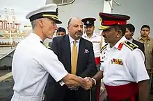 General Crishanthe (right), handshaking with the Commanding Officer of USS New Orleans (LPD-18) Captain Glenn Jamison on July 27, 2016