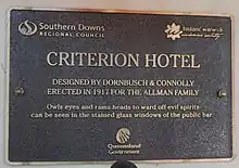 - It is important in demonstrating the evolution or pattern of Queensland's history: The erection of the hotel in 1917, replacing an earlier hotel building, is important in demonstrating the high level of building activity in Warwick town during the early twentieth century when many of the general stores and hotels were re-built or renovated. The Criterion Hotel has an association with the Allman family, who ran other hotels in Warwick during this period, and who were actively involved in the development of Warwick from the 1880s.[1]