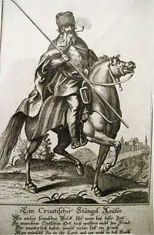 The Croats, also known as Cravats or Crabats,[6] were 17th-century light cavalry forces in Central Europe, comparable to the hussars.[7] The Croats were initially irregular units loosely organized in bands. The first regular Croat regiment was established in 1625.