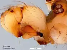 C. lyoni can be distinguished from other members of the genus through several ways: by the characteristic boxy shape of their abdomens (C. cylindrogaster has a cylindrical abdomen); by the presence of two apophyses (jutting structures) in the chelicerae of males (C. pristina, C. semicaudata, and C. soudanensis all possess only one apophysis on each chelicera);[10] or simply by geographic distribution (C. lyoni can be found globally and is the only species of Crossopriza in the New World, while the other species like C. johncloudsleyi and C. nigrescens are restricted to Africa or the Middle East).[2][10]