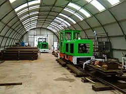 In 2014, the Society discovered that two of the original Schoma locomotives that had worked on the moors were for sale by a dealer based in Norfolk. Two visits were made to inspect them, the second on 16 February 2015, after which a price was agreed, although the locomotives, together with three slave units, remained at the premises of the dealer Ray King until a suitable location could be found to store them.[16] The Poly-Peat site was now owned by North Lincolnshire Council, and became the base for the operation, while the Society was renamed Crowle Peatland Railway. They received funding of £10,000 from North Lincolnshire Council and the Isle of Axholme and Hatfield Chase Landscape Partnership to fund the restoration of the locomotives. The Partnership obtained a grant of £1.84 million from the Heritage Lottery Fund, which benefitted a number of local projects, including the railway.[17] The Schoma locomotives were moved from Norfolk to a Romney hut, also used as covered accommodation for a herd of goats, on 10 May 2016, and were subsequently joined by the Simplex.[16] The Society then received a grant of £23,000 from the SSE Keadby Grange Windfarm, to finance the construction of a new Romney hut, to act as a workshop for the project[17] Planning permission for the building was granted on 30 June 2017[18] and the Schoma locomotives were moved into the completed building on 5 September 2018.[16] Meanwhile, the Simplex locomotive was moved to North Lindsey College, for engineering students to carry out the restoration work as part of their course.[19]