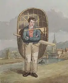 The Severn Estuary and the estuaries of the Usk and Wye were also fished using lave nets. These are Y-shaped nets consisting of a handle and two arms from which the net is hung.[44] Clenching nets are another type of net used on the Wye, these resemble a hand net which is hung at the end of a long pole.[45] Stop-nets are another type of net which are used along the Severn and Wye from boats which are anchored to withstand the force of the tide.[46] Coracle fishing also took place on the Severn, Usk and Wye but ended in the 1930s[47] The coracle used on the Usk and Wye was known as the Monmouthshire truckle and was similar in design to the Tywi coracle.[48] On the Severn, three types of coracle were used: the Ironbridge coracle, the Shrewsbury coracle and the Welshpool coracle.[49] Drift netting and seine fishing also took place on the lower, wider stretches of these three rivers, where the current is stronger.[50]