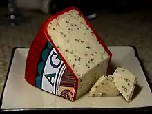 Up until the 18th century large goat herds provided milk for cheese and there has been a revival in the production of goat cheese since the twentieth century, particularly around Abergavenny. .[76] Pantysgawn Farm produces a soft goat's cheese based on an old recipe called Pantysgawn. The farm also produces St Illtyd Cheese, a mature cheese made with garlic, white wine and herbs; St David's Cheese, a continental-style washed-rind cheese; and Y Fenni cheese, a mature cheese milled with ale and mustard seeds.[77] Rees writes that Y Fenni Cheese has a tangy mustard flavour, moist texture and pale-yellow colouring. It is coated with wholegrain mustard seed and Welsh ale and preserved in a cream-coloured wax.[78] Davies refers to a recipe called Breast of Chicken filled with Y Fenni Cheese, where this cheese is used as a stuffing with parsley [79]