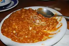 The mountains areas have more corn-based dishes. Xalapa is known for its street foods of this type, such as picaditas and a related dish called garnadchas. Both are thick, bean-stuffed corn cakes.[2] One notable dish of the mountain areas is zacahuil, which is generally described as a giant tamale often several feet long, able to feed between fifty and 150 people.[3][10] Like tamales in Mexico, it consists of corn, flavorings and meat, which are wrapped then cooked. For sacahuil, the wrapping is either leaves from a plant called papatla or those from the banana tree, laid out. Roughly ground corn meal mixed with lard and chili peppers, seasonings and salt is spooned over the leaf wrapping. Pieces of meat, usually pork, are laid on top of this. The leaves are folded over the filling and tied in place then the zacahuil is placed in an oven to cook for ten to twelve hours. However, unlike most tamales, the consistency of the filling after cooking is not solid, but rather stew like. The dish is generally served for weddings, religious festivals and other special events. Prepared portions are often sold in traditional markets, restaurants and by street vendors.[10]