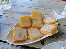 The keshi yená (stuffed cheese) is traditionally a hollowed out red Edam cheese is soaked and then stripped of the red wax layer and filled with a meat or fish filling, including capers, raisins, plums and olives. In a well-fitting form it is then prepared in a bain marie or put in the oven. The heat softens the cheese rind. At the end of the baking time, the keshi yená is turned out onto a plate, after having cooled down a bit, cut like a cake and served. For convenience, instead of the hollowed-out, round Edam cheese, which gives the dish its typical taste and soft pink color, a tin baking sheet is lined with slices of Gouda cheese. Similarly to the ayaca, the keshi yená is often served as an hors d'oeuvre.[15]