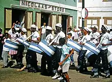 The Allied victory of World War II was commemorated by a large parade in San Nicolas, consisting largely of Caribbean-English immigrants who came to Aruba to work at the Lago Oil Refinery.[22] The first steel and brass bands debuted a few years later and small parades sprouted here and there. Groups within the Aruban elite have taken up this celebration and expended it further. Aruba Tivoli Club, a private social club, started in 1944 with small celebrations.[23]