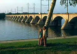 The present concrete structure was completed about 1916. Although the majority of the bridge has been abandoned for rail use over the past several decades, it has been suggested the bridge become the principal crossing for the Corridor One rail commuter system to serve the renewed rail needs of the metropolitan area and of Harrisburg's west shore. With its standing ownership agreements, this plan faces major challenges as the bridge is currently shared among three owners. Two of these are the railroads on either side which continue to operate on the tracks immediately off of the bridge on either side. The third owner is Capital Area Transit which currently does not own any property with immediate access to the bridge.[2] Immediately to the south of the Cumberland Valley Bridge, a similar iron truss structure was erected in 1891 by the Reading Company, originally known as the Philadelphia and Reading Railroad.