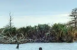 Habitat types common to most barrier islands are found on the refuge. Moving westward from the Atlantic Ocean to Currituck Sound, these habitats include sandy beaches, grassy dunes, interdunal wetlands (flats), maritime forests and shrub thickets. Currituck Sound's shoreline is made up of brackish water marshes and occasionally, mudflats that have been exposed by wind tides. A few forested islands also exist on the refuge. Monkey Island, a noted bird rookery, provides nesting habitat to several species of wading birds. It is also currently the most northerly known native habitat of the Sabal minor palm.[2][3] In addition to Sabal palms, vegetation within these diverse habitat types include several varieties of beach grasses, live oak, loblolly pine, wax myrtle, cattails, sedges and rushes, black needlerush (Juncus roemerianus) and giant cordgrass (Spartina cynosuroides).