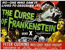 The Curse of Frankenstein is a 1957 British horror film by Hammer Film Productions, loosely based on the 1818 novel Frankenstein; or, The Modern Prometheus by Mary Shelley.[7] It was Hammer's first colour horror film, and the first of their Frankenstein series.[8] Its worldwide success led to several sequels, and it was also followed by new versions of Dracula (1958) and The Mummy (1959), establishing "Hammer Horror" as a distinctive brand of Gothic cinema.[9]