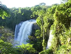 The upper part and the lower part of the Curuá River are divided by two waterfalls, only 50 m (160 ft) apart. The first waterfall is 60 m (200 ft) tall and the second is 40 m (130 ft) tall.[4] As a consequence, the fauna in the upper part, above the waterfalls on the Serra do Cachimbo plateau, is highly distinct and includes several endemic fish: three Lebiasina species, Brachychalcinus reisi, Erythrocharax altipinnis, Jupiaba kurua, Knodus nuptialis, Moenkhausia petymbuaba, Leporinus guttatus, three Harttia species, three Apistogramma species (including A. kullanderi, the largest in the genus), and others. These are to some extent protected by the reserve, but habitat loss continues and the proposed building of dams, which would remove the waterfalls that isolate the endemics from more widespread species in the lower part, potentially represents a serious threat.[4][5][6][7][8]
