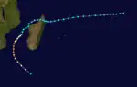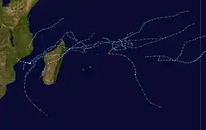 During the season, the Météo-France office (MFR) on Réunion island issued warnings in tropical cyclones within the basin. Using satellite imagery from National Oceanic and Atmospheric Administration, the agency estimated intensity through the Dvorak technique, and warned on tropical cyclones in the region from the coast of Africa to 90° E, south of the equator. The World Meteorological Organization recognized the MFR as a Regional Tropical Cyclone Advisory Centre in 1988, and would later label the agency as a Regional Specialized Meteorological Center in 1993.[1] The Joint Typhoon Warning Center (JTWC), which is a joint United States Navy United States Air Force task force, also issued tropical cyclone warnings for the southwestern Indian Ocean.[2] The season's nine named storms is equal to the long term average, while the five tropical cyclones – a storm attaining maximum sustained winds of at least 120 km/h (75 mph) – was slightly below average.[3] The MFR considered the tropical cyclone year to begin on August 1 and continue to July 31 of the following year.[1]