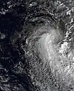 On March 17, the JTWC upgraded Gasitao to the equivalent of a minimal hurricane. On the next day, the MFR upgraded it to tropical cyclone status as the storm slowed and turned to the south and east. The cyclone developed a well-defined eye during this time, surrounded by a powerful central dense overcast. On March 19, the JTWC estimated peak 1 minute winds of 240 km/h (150 mph) while the storm was passing 350 km (220 mi) northeast of Rodrigues. The MFR assessed that Gasitao reached winds of 150 km/h (93 mph) that day before weakening, although the cyclone restrengthened on March 20 to a peak of 170 km/h (110 mph). It accelerated southeastward while gradually weakening.[23][24] On March 23, Gasitao became extratropical,[25] and the remnants dissipated two days later as they were absorbed into the westerlies.[23]