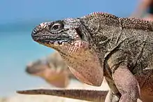 It is diurnal, spending nights in 'retreats' under the leaves of thatch palms, in tunnels they sometimes dig and sometimes in the open.[1] It also uses crevices and holes in limestone rocks as retreats and will congregate in areas rich in these.[11] Outside of the mating season, male rock iguanas have dominance hierarchies rather than strictly defended territories like Cyclura from other islands. This has been attributed to the regular food supply from tourists feeding the lizards on the beach causing a disruption in their social structure.[12] However, a 2000 report demonstrated this theory tested on Alligator Cay, which is free from tourists, and also found a low amount of male-to-male aggression in this species. The author of that study pointed to the small nature of the inhabited islands as a reason for reduced aggression.[13]