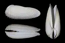 Cyrtopleura costata, or the angel wing clam, is a bivalve mollusc in the family Pholadidae. It is found in shallow parts of the northwest Atlantic and also in the North Sea of Scotland coastline and west coast of the Adriatic Sea by a remote area in the Marche region in central Italy, living in the seabed, where it digs its burrows on a very slow revolving movement for years through soft sand and mud always to a max depth of 8ft but always below 3 feet (0.91 m) at the lowest tide.[2]