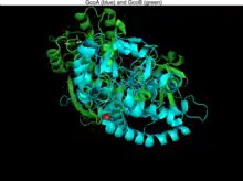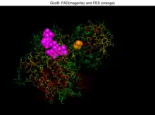 ![]() Crystal structure of gcoB (cartoon diagram) complexed with FAD (magenta spheres) and an iron–sulfur cluster (orange/yellow) based on PDB: 5OGX.[1] | |||||||