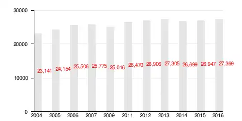 According to the Central Statistical Office data, the district's area is 12.26 square kilometres (4.73 square miles) and 27 369 people inhabit Czyżyny.[1]