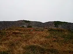 Dún Fearbhaí is a stone ringfort (cashel) shaped like a square with rounded corners; it contains two walls and one terrace built on a steep incline, and also four sets of internal stairs. The walls are up to 4 m (13 ft) high and up to 3 m (9.8 ft) thick, and measure about 27 m (89 ft) by 23 m (75 ft) internally.[9][10] There is a single entrance in the east, 2 m (6 ft 7 in) wide. O’Driscoll wrote, "A thick wall would have been necessary for larger, higher walls, resulting in excessive labour and resource costs. This was partly alleviated by terracing the walls, reducing the amount of material used. Terracing of the inner face and incorporation of steps allowed access to the top of the wall, permitting occupants expansive visibility of the immediate environs as well as a strategic advantage over approaching attackers. The vertical walls that met attackers or visitors would have been an impressive barrier that provided practical defence for the occupants, as well status."[11]