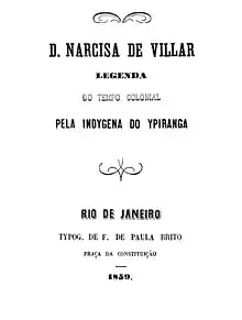 D. Narcisa de Villar: Legenda do tempo colonial (Portuguese for 'Mrs. Narcisa de Villar: A Story of Colonial Times') is a novel by Ana Luísa de Azevedo Castro, first published as a book in 1859. Castro published it pseudonymously as Indígena do Ipiranga (Portuguese for 'Ipirangan Indigenous Person').[1] Before its release as a novel, the work was serialized in A marmota, a newspaper published in the state of Rio de Janeiro.[2]