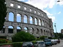 In classical antiquity, the Via Flavia road built by the emperor Vespasian in 78 AD ran through the same area spanned by modern D21. The Via Flavia followed a north–south route in the western part of the Istrian Peninsula, connecting Tergeste, present-day Trieste, to Pula via Poreč. In Pula, the Roman road extended further to the northeast to Nesactium and Tarsatica – modern-day Trsat area of the city of Rijeka.[14]