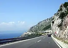 The D8 state road is the Croatian section of the Adriatic Highway, running from the Slovenian border at Pasjak via Rijeka, Senj, Zadar, Šibenik, Split, Opuzen and Dubrovnik to the border with Montenegro at Karasovići.[maps 1][1] Most of the D8 state road remains single carriageway, though with some dual carriageway stretches. The total length of the road through Croatia is 643.1 kilometres (399.6 mi).[2]