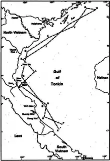 SIGAD USN-467N specifically designates the DSU aboard USS Maddox during the patrol involved with the Gulf of Tonkin incident.[5][8] This patrol was 18th DESOTO type patrol (each with a Naval Security Group detachment embarked) conducted since 1962.[9] On August 2, 1964, the destroyer Maddox, engaged three North Vietnamese Navy torpedo boats of the 135th Torpedo Squadron.[10] A sea battle resulted, in which Maddox expended over two hundred and eighty 3-inch (76 mm) and 5-inch (127 mm) shells, and in which four USN F-8 Crusader jet fighter bombers strafed the torpedo boats. One US aircraft was damaged, one 14.5-millimeter (0.57 in) round hit the destroyer, three North Vietnamese torpedo boats were damaged, and four North Vietnamese sailors were killed and six were wounded; there were no U.S. casualties.[11]