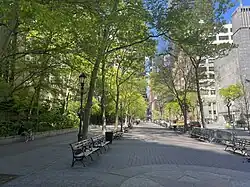 Plans for the new park were originally conceived in 1947 as part of a new landscaped approach to the headquarters of the United Nations, which then was being developed on the east side of First Avenue between East 42nd and 48th streets in Turtle Bay, Manhattan. The city proposed widening and reconstructing several streets in the vicinity of the United Nations to accommodate the new complex, one of which was the segment of East 47th Street from First to Second avenues. Specifically, the city's plans called to widen this street from 60 to 160 feet (18 to 49 m) to create a two-way thoroughfare.[3][4] The road was to consist of two 30-foot-wide (9.1 m) roadways separated by a 12-foot-wide (3.7 m) median, with a landscaped park running along the remainder of the south side of the street.[3][5] This project was to cost about $1 million.[6] The widened section of 47th Street was intended to serve the northern part of the United Nations headquarters, complementing the widening of 42nd Street to the south.[4]