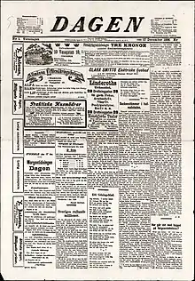 Dagen was a Swedish newspaper published in 1896–1920. It began to be published in Stockholm in December 1896 as a cheap newspaper, publishing daily with an evening edition starting in 1905. Its owner was the publishing company of Aftonbladet, and both papers had a common editor-in-chief, administration and office, but Dagen had its own editorial office.[1]