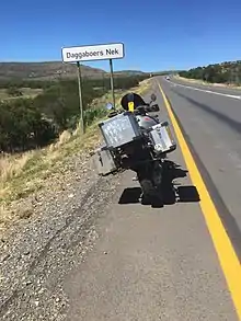 It was named for the farm Daggaboersnek, which up to 1752 was known as Knapzakfontein.[2] The pass has been in regular use since the 19th century, and a blacksmith, trading post, police station and small hotel were established there. The voortrekker Louis Tregardt for a time (c.1814–1820s) farmed in its vicinity, as did Piet Retief on the northern approach to the crest.[3] In 1837 Benjamin D'Urban determined that the boundary between districts Cradock and Somerset would run over Daggaboers Nek.[4] The 8th Frontier war (1850–1853) took place in the general area,[2] and on old year's eve 1851, deserters from the Cape Corps ambushed and killed two young men, Henry and Edward Trollip, at Sunnyside farm near the nek.[5] The Trollips were British Settlers whose graves can still be seen here, the earliest dating to 1856.[3]