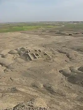 Dahan-e Gholaman is the largest Achaemenid site in all of eastern Iran.[2] Some 27 structures aligned roughly in a straight line running SW to NE along the northern edge of the site were excavated by the Italian archeologist U. Scerrato in 1962–1965 and by the Iranian archeologist S. M. S. Sajjadi in 2000–2005. Further geophysical and surface exploration in 2007–2011 revealed the outline of another monumental building situated 2 km south of the northern complex of buildings.[3] Several of the larger structures excavated or detected at Dahan-e Gholaman have regular rectangular or square plans and bear comparison with the palatial buildings and audience halls of the Achaemenid royal residences at Pasargadae and Persepolis, as well as Dasht-e Gohar.[4] One of the structures has been identified as a religious building, its three altars possibly dedicated to the leading Persian gods Ahura Mazda, Anahita, and Mithra.[5]