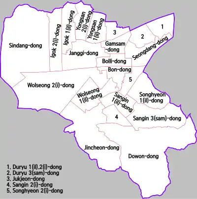 Dalseo District (Dalseo-gu) is a district in western Daegu, South Korea. It borders Dalseong-gun on the north, south, and west, and Seo-gu and Nam-gu on the east. It has a population of about 610,000, and an area of 62.27 square kilometers. The population rose dramatically in the 1990s, and has been approximately level since 2000.