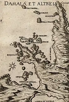 When in Constantinople, Antonio had becomes friends with the Sultan's son-in-law, Grand Admiral Piali Pasha. For this reason, when Piali Pasha occupied Chios in 1566, he invited him to settle there and at the same time gave him his ancestral estates that the Maona took from the Zaccaria.[36] Upon arriving in Chios Antonio took over lands in Volissos, Kardamyla, Delfini, Lagkada, Kalamoti, Kampos and the Dafnonas tower. After 1566, Antonio lived in the tower where he also owned the "Stratigato" and the "Damalà" estates, whose churches he renovated. These churches were Panagia Coronata and Sotira.[37] These two churches, fortified towers, and manor house were all severely damaged during the 1822 massacre of Chios and subsequently damaged further by the earthquake of 1881. To this day there is an area of Dafnonas called "τού Δαμαλά" (belonging to Damalà) at the "Stratigato".[38]