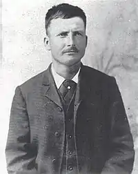 By 1886, Bogan was in Wyoming working for the Vorhees Ranch, near Lusk, Wyoming. He is known to have killed three men by this time, one was the alleged murder of a dance hall proprietor who prohibited Bogan and his men from ever entering his saloon. Bogan, who had taken the alias of Bill Gatlin at that time, still forced his way into the establishment, and when he met the proprietor with a rifle in his hands, Bogan drew his revolver and shot him in cold blood.[1] Bill Calkin, the editor of the local newspaper, wrote that Bogan was possibly a cowboy wanted in Texas, and who had gone by at least two other names in the past. Bogan was infuriated, and Bogan set out looking for him, accompanied by cowboy Sterling Balou. The two entered the Cleveland Brothers Saloon, at which point Bogan drew his pistol calling for Calkin, and daring any of his friends to challenge him. One of the Cleveland brothers was able to bring a sawed off shotgun to bear on the two cowboys, and seconds later Constable Charles S. Gunn entered with his own pistol drawn, backing Cleveland. Bogan and Balou retreated and fled.[1]