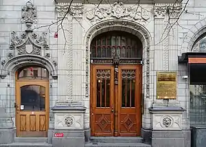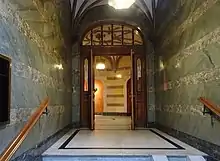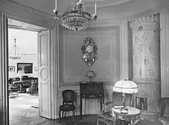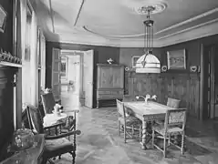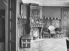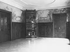 The ground floor housed shops and a concierge apartment. On the first through third floors above this level were very large apartments with 11 rooms and a kitchen divided into a lounge, dining room, atrium, two master bedrooms, four bedrooms and two rooms for the staff. In addition, each apartment had a hall with a cloakroom, dining room, a bathroom and two toilets. On the fourth (5th American) floor, the floorplan was divided into two apartments with 4 and 7 rooms and a kitchen. The floors were reached via a main staircase (with an elevator from the very beginning) and a kitchen staircase; the latter would be used by the staff. The apartments had very lavish furnishings with, among other things, expensive tiled stoves, wall panels and murals. Bror August Danelius himself lived with his family on the second (third American) floor.[4] His residence was decorated with murals by the artist Georg Pauli.