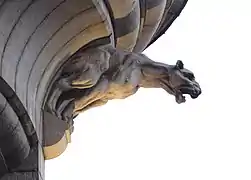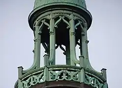 The client's initials, an intertwined BATH, are found above the portal towards Birger Jarlsgatan, on the tower towards Stureplan and towards Biblioteksgatan on small coats of arms. The limestone facade otherwise has a rich sculptural decor with, among other things, putti, animal heads and bird nests. From the lowest bay of the tower, two roaring panthers stretch out towards the street. The exterior of the building is lively with bay windows, towers, gables, and balconies. The tower facing Stureplan is crowned by a tall copper-clad lantern. Basements and foundation walls were made of concrete, and the foundation rests on a large number of piles. The basement roof consists of concrete arches between iron beams, otherwise the floors have wooden floors.