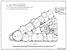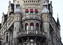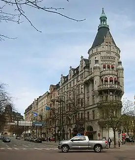 The Daneliuska huset ("Danelius Building") is a structure in the Landbyska verket neighborhood of Stockholm, Sweden. It is sometimes called the Strykjärnshuset (Flatiron Building) because it sits on a wedge-shaped plot between Birger Jarlsgatan, Biblioteksgatan, and Stureplan, in the Östermalm district in the city center.[1] The building is recognizable by its steeply-pitched conical tower and its richly decorated limestone facade in an early French Renaissance style. The building is blue-marked by the City Museum of Stockholm, which means that it represents "extremely high cultural-historical values."[2]