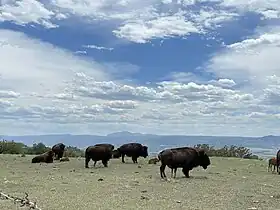 The prominent Riley Hill ridge bisects the park and reaches the 6,600-foot elevation Wildcat Point.[5] The landscape of the park includes varied topography, including pastureland, rocky outcroppings, and a sandstone mesa.[2] It is the Denver Mountain Parks system's sole prairie park.[5] Much of the park is inaccessible to the public due to the presence of a herd of bison.[18][19] Elk also roam the park's grounds.[2]