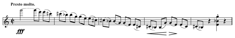 The third theme begins as a chantlike monotone played by horns and trumpets on E♮ against a string tremolo in C♯ minor. It cadences on a tonally ambiguous diminished seventh on G♯: