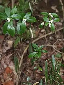 The shrub is evergreen, and grows from 0.5 to 2.0 meters tall. Its branches are dark purplish red or brown. It is often found in forests and moist places at an altitude of 300 to 400 meters.[2]