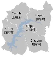 The township comprises five villages: Dapu, Heping, Jiadong, Xixing and Yongle.