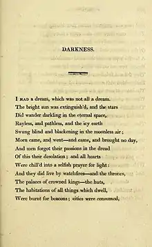 "Darkness" is a poem written by Lord Byron in July 1816 on the theme of an apocalyptic end of the world which was published as part of the 1816 The Prisoner of Chillon collection.