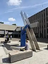 A zinc and stainless steel structure, intended to depict the resurgence of the area, was designed by John Hoskin and erected outside the town hall. When Princess Anne was asked to unveil a small plaque linked to the structure, Michael Palin records in his diaries that she turned to the journalist, Kate Adie, and exclaimed "F*** Me".[8][9][10] The plaque referred to "The Spirit of New Darlington" but the structure subsequently became known as "Resurgence".[6]