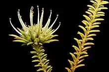 The flowers are arranged in heads of 20 to 40 flowers at the ends of the branches, the heads 20–30 millimetres (0.8–1 in) wide. The heads are surrounded by layers of bracts, the outer ones green or greenish-red and 5–7 millimetres (0.2–0.3 in) long and shorter than the flowers. The petal lobes are about 3 millimetres (0.1 in) long and 1–2 millimetres (0.04–0.08 in) wide, enclosing the stamens, staminodes and the lower part of the style. The style is often reddish and 12–15 millimetres (0.5–0.6 in) long with a ring of hairs near its tip. Flowering occurs from mainly in spring but also from late winter to early summer.[2][3]