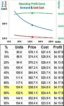 Fig. 15 A single instance example (simulation draw) of the three components that form the operating profits graph. The triangular markers indicate a maximum value for operating profit, delineating optimal price, units, and cost values. Yellow rows indicate optimal ranges.