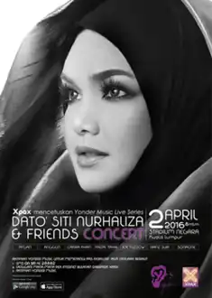 Yonder Music Live Series: Dato' Siti Nurhaliza & Friends Concert (also known as Dato' Siti Nurhaliza & Friends Concert or simply Dato' Siti Nurhaliza & Friends) was a single day concert by Malaysian recording artist, Siti Nurhaliza. Sponsored by Celcom and Yonder Music, the free concert was only available exclusively to Celcom users who are subscribers of the Yonder Music mobile app. It was held on 2 April 2016 and she was supported and accompanied by five Malaysian artists and three Indonesian artists. Staged at Stadium Negara, the supporting acts during the night of the concert were Faizal Tahir, Hafiz Suip, Jaclyn Victor, Joe Flizzow, and SonaOne of Malaysia and Afgansyah Reza, Anggun, and Cakra Khan from Indonesia.[1][note 1]