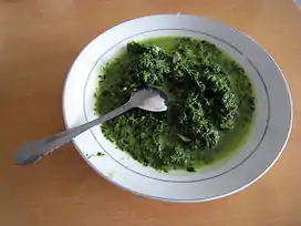 Daun ubi tumbuk (Indonesian for "pounded cassava leaves") is a vegetable dish commonly found in Indonesia, made from pounded cassava leaves. In Indonesian, daun means leaf, ubi refers to cassava, and tumbuk means pounded. The cassava leaves are traditionally pounded with a wooden mortar and pestle, although finely chopping or puréeing them using a blender or food processor is an alternative.