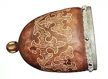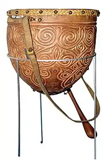 The dauylpaz is an ancient, cauldron-shaped musical instrument. One end of the drum is an open space with taunt leather stretched across the larger, bowl shaped base.[1] The instrument is played with a stick or mallet, and is worn on a belt.[2]