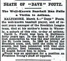 18. "Death of "Dave" Foutz – The Well-Known Baseball Man Falls a Victim to Asthma". New York Times. March 5, 1897. p. 2. Retrieved 9 March 2018.