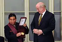 Following Morales' 2005 election to the presidency, Choquehuanca was appointed to serve as foreign minister in the new president's first cabinet.[16] Morales' inclination toward entrusting Choquehuanca with the foreign affairs portfolio dated as far back as the late 1990s during a visit to Libya, where the future president said as much to the then-Libyan foreign minister. Choquehuanca, however, had not been as keen on the idea, initially seeking out someone else—preferably an Aymara—to fulfill the role. In the end, he ultimately accepted Morales' offer; "I [said], 'if I don't accept, [the new minister] will be the same as always, and one day I will feel guilty", he stated.[17] In assuming office, Choquehuanca became the first indigenous person to occupy the office of foreign minister in Bolivian history.[18]