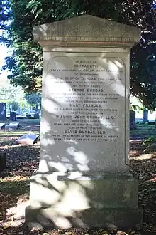 He is buried with his parents and siblings (including William John Dundas) in Warriston Cemetery in Edinburgh. The grave stands at the north side of the main upper east–west path, towards its western end.