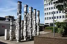 Having spent a year as a self-employed artist, Harding answered an advert in The Scotsman for a post with Glenrothes Development Corporation. From 1968 to 1978 he was town artist, working with the planning department to create site-specific work using the same concrete and brick as the newly developed housing.[4] [5] His works in Glenrothe include Henge, a spiral of cast concrete slabs; Industry, a mural on an underpass based on patterns on African huts; Heritage, rows of concrete embossed columns; Dark Cemetery in Pitteuchar; and ten poetry slabs at bus stops, phone boxes, and the Glenwood shopping centre. Henge and Industry are now listed.[4] As his assistant, Stanley Bonnar created a concrete hippo; Harding and Bonnar placed them in groups at multiple sites in the town.[1]
